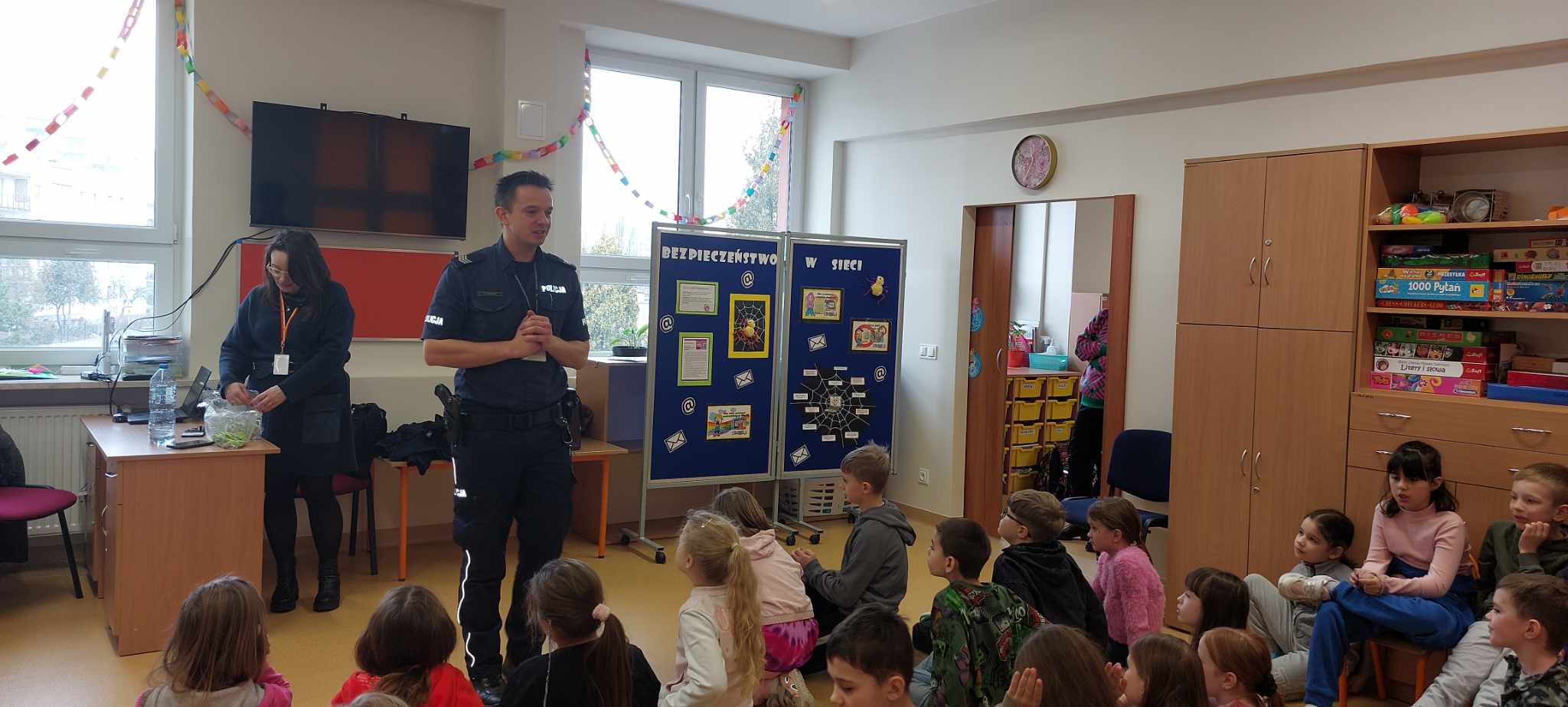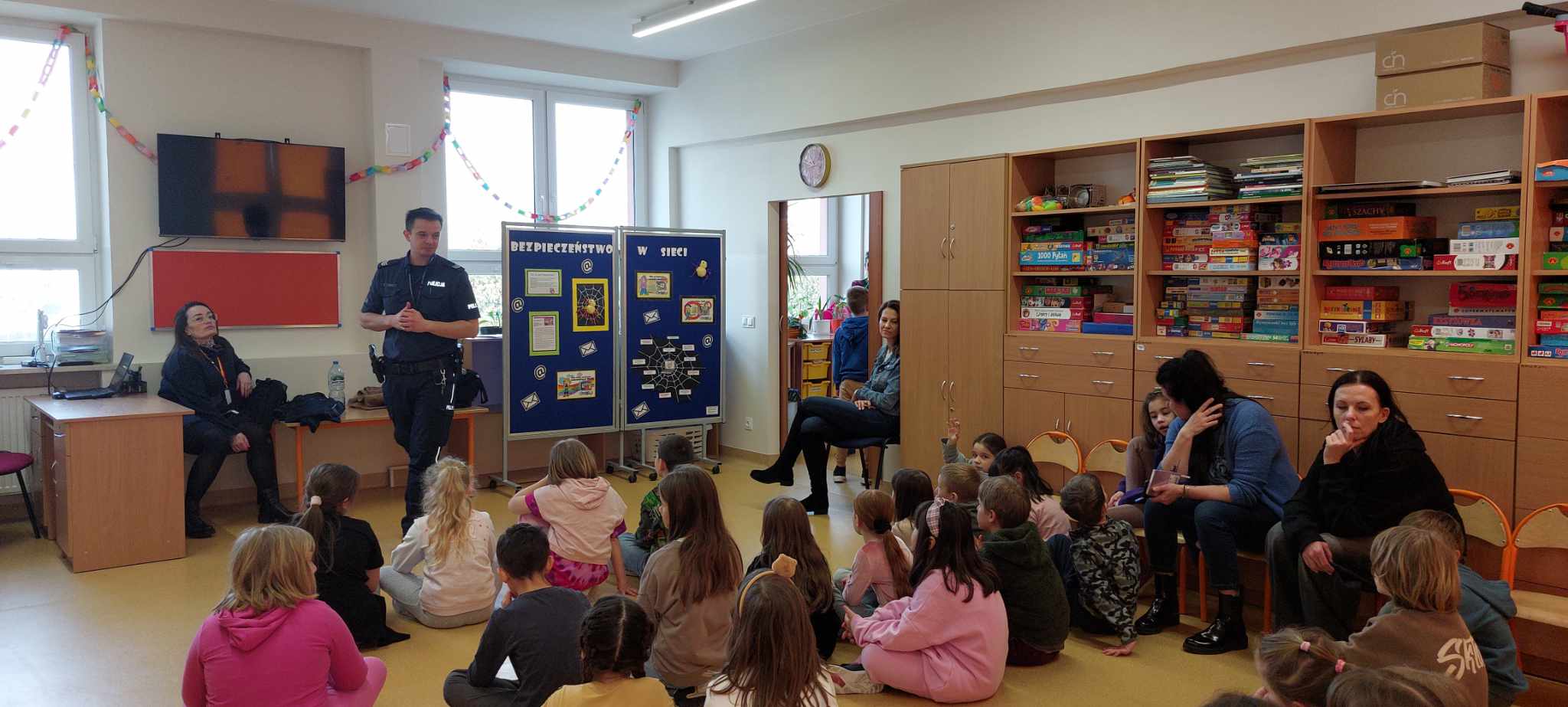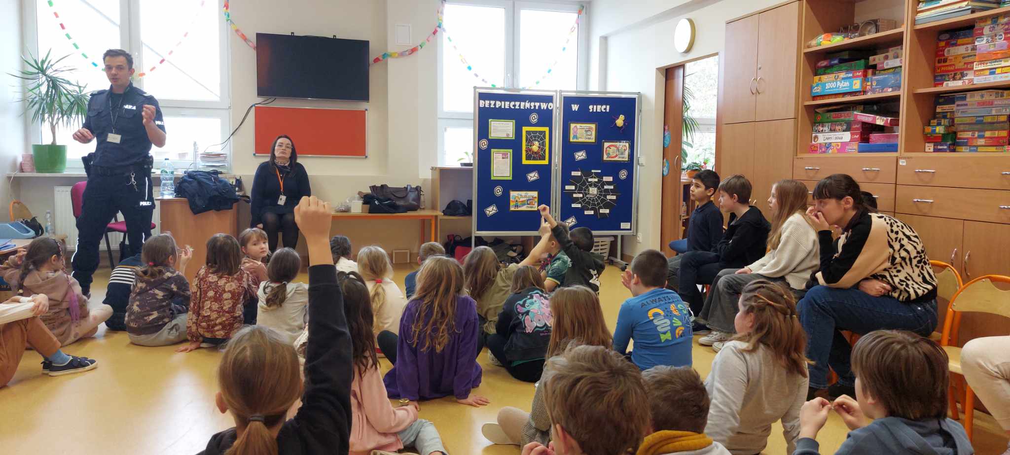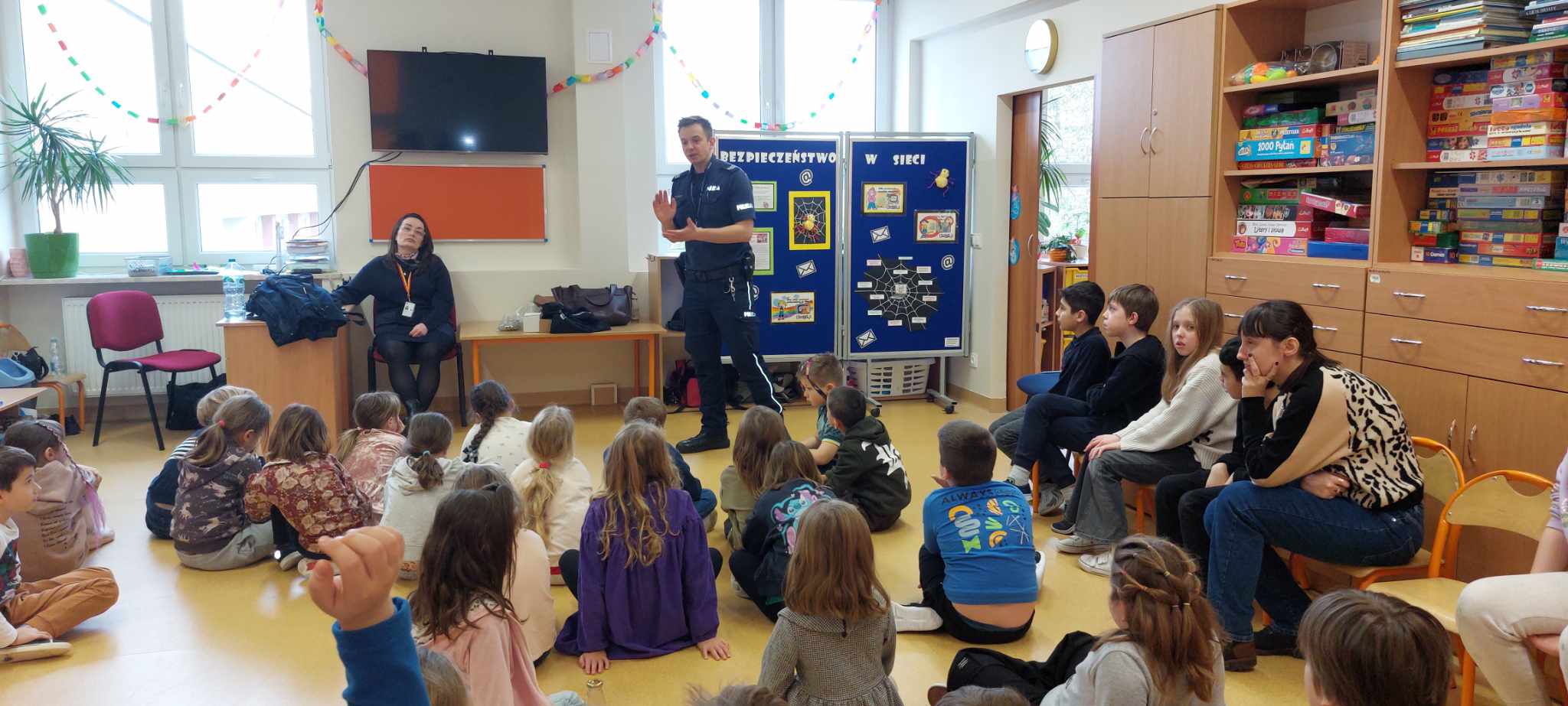 W ramach obchodów Dnia Bezpiecznego Internetu (DBI), 26 marca 2025 r. uczniowie uczęszczający do świetlicy szkolnej wzięli udział w zajęciach profilaktyczno-edukacyjnych pt. „Bezpiecznie w sieci”, prowadzonych przez policjanta z Wydziału Prewencji Komendy Rejonowej Warszawa II. Spotkanie odbyło się w dwóch grupach wiekowych: młodszej i starszej.
