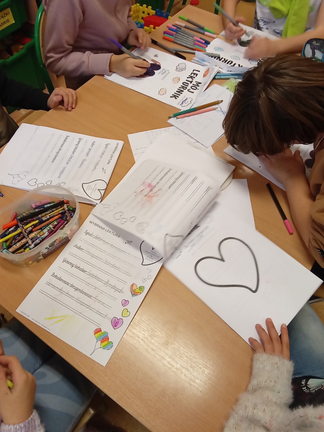 Uczniowie naszej świetlicy już kolejny rok biorą udział w Międzynarodowym Projekcje Edukacyjnym „Czytam z klasą. Lekturki spod chmurki”, wspierającym rozwój czytelnictwa. W każdym z modułów projektu klasa II B mogła wybrać dowolną z zaproponowanych lektur, do których następnie wykonywała najróżniejsze zadania. Poznaliśmy „Detektywa Pozytywkę” Grzegorza Kasdepki, „Dziadka i niedźwiadka” Łukasza Wierzbickiego, „Cukierku, ty łobuzie!” Waldemara Cichonia, „Drzewo do samego nieba” Marii Terlikowskiej, „Niesamowite przygody dziesięciu skarpetek” Justyny Bednarek, „Baśnie” Hansa Christiana Andersena, „O psie, który jeździł koleją” Romana Pisarskiego. Tworzyliśmy „Lekturkowy zegar”, „Lekturkową pizzę”, „Lekturki w pudełku i na wieszaku”. Grupa dzieci pracowała nad reklamą, inna nad ogłoszeniem radiowym. Bawiliśmy w „Gorące lekturkowe krzesło” i teatr cieni. Razem z uczniami klasy 2b wyruszamy w kolejną podróż z „Piaskowym Wilkiem” Asy Lind, pełną kreatywnych i ciekawych przygód. Celem projektu jest nie tylko rozbudzanie u uczniów ciekawości literackiej i aktywności czytelniczej, ale i kształtowanie postaw społecznych, profilaktyka przeciwdziałania przemocy rówieśniczej oraz wsparcie zdrowia psychicznego.