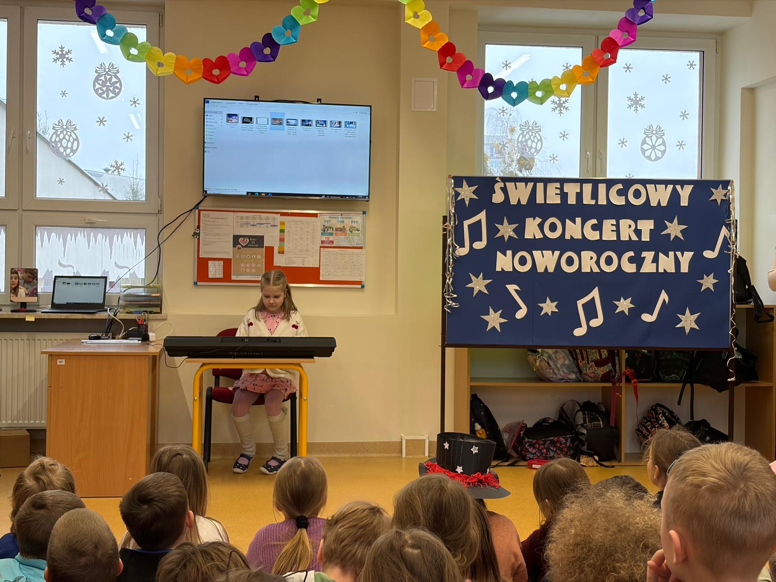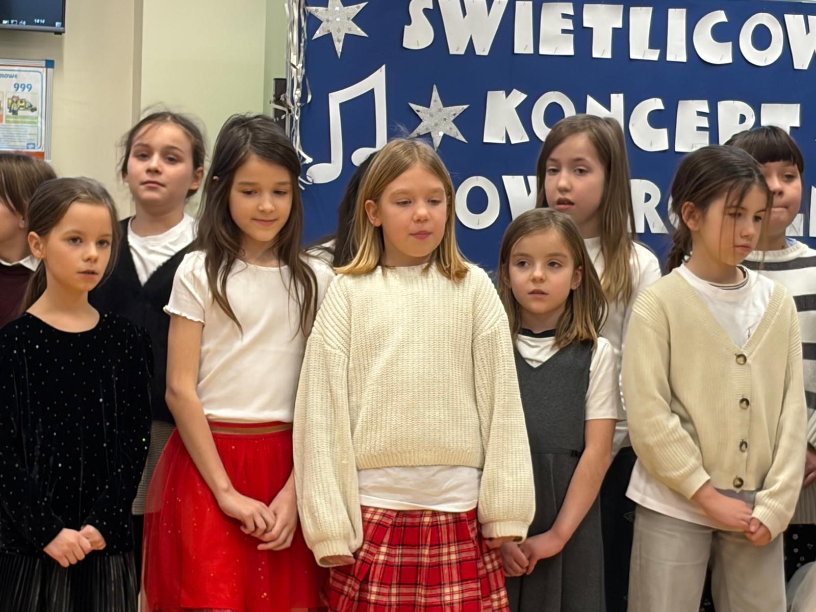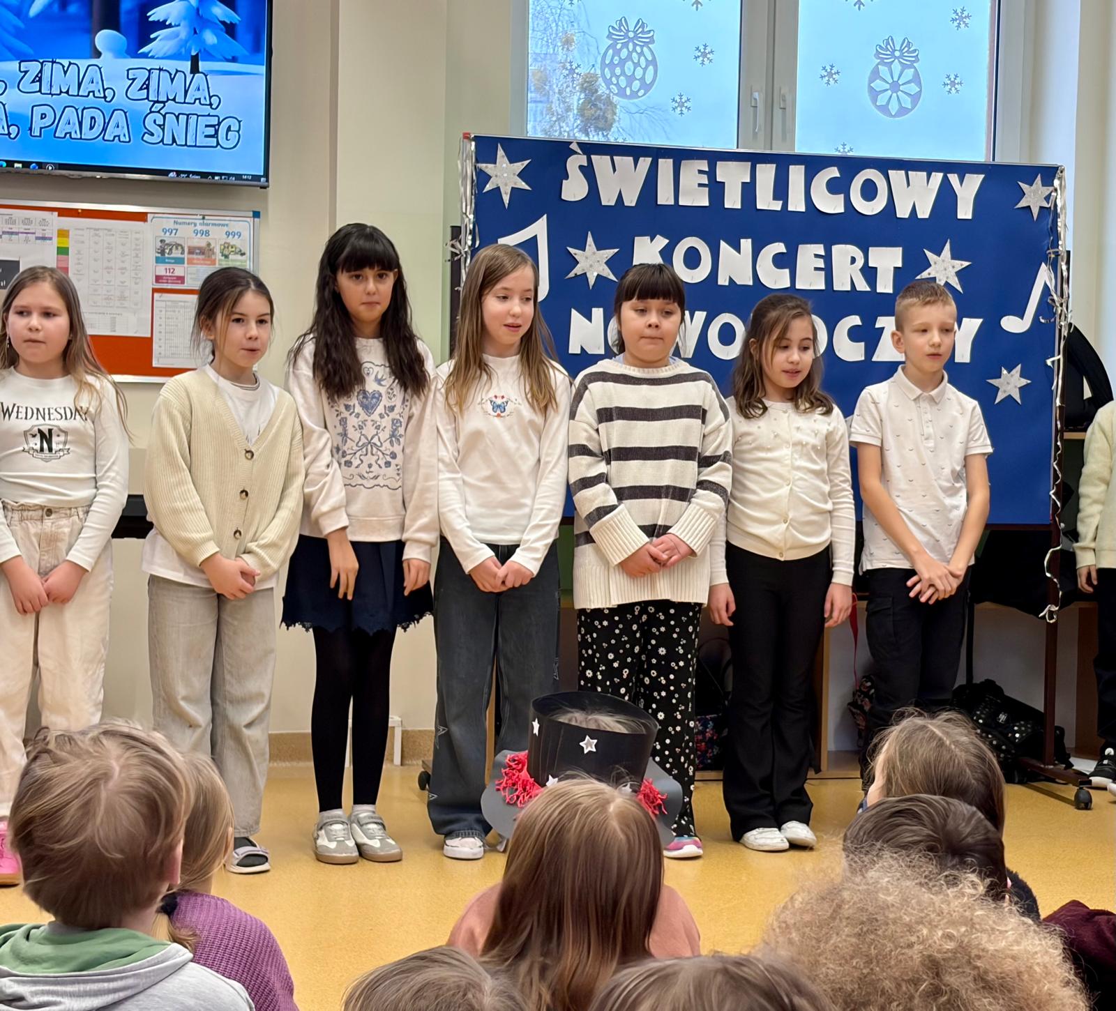 Dnia 10. 02. 2026 w naszej świetlicy odbył się już kolejny Koncert Noworoczny. Uczniowie z różnych grup zaprezentowali swoje umiejętności wokalno-instrumentalne w piosenkach: „Zima woła nas” (kl. 2B), „Mała śnieżynka”(uczennice z kl. 1A I 1B), „Przyjedź do nas Mikołaju” (uczennice kl. 2C), „Zima, zima, zima” oraz „Zaśnieżone miasta”(uczennice z kl. 3C). Wspólnie zaśpiewaliśmy piosenkę „Pada śnieg”. Wysłuchaliśmy pięknej poezji w wykonaniu A. Dąbrowskiej i A. Komisarskiego (kl. 3C), którzy recytowali wiersz zatytułowany „Kolorowy śnieg”, (uczennica kl.3C) wiersz pt.: „Zima”. Słuchaliśmy również utworu „Zimowe rady”(uczennice kl.3C). Koncert uatrakcyjnił występ uczennicy z kl. 2A , która zagrała dwa utwory na kaybordzie: „Deck the Halls” i „Koci blues”. Podziwialiśmy układ taneczny z szarfami do utworu A. Vivaldiego „Zima” w wykonaniu uczennic z kl. 3C. Odgadywaliśmy też zagadki bajkowo – muzyczne. Mamy nadzieję, że ten koncert sprawił dużo radości ze wspólnego słuchania i śpiewania oraz otworzył nasze serca na nowe doznania artystyczne w Nowym Roku. Artyści zostali nagrodzenie gromkimi brawami, dyplomami i upominkami.