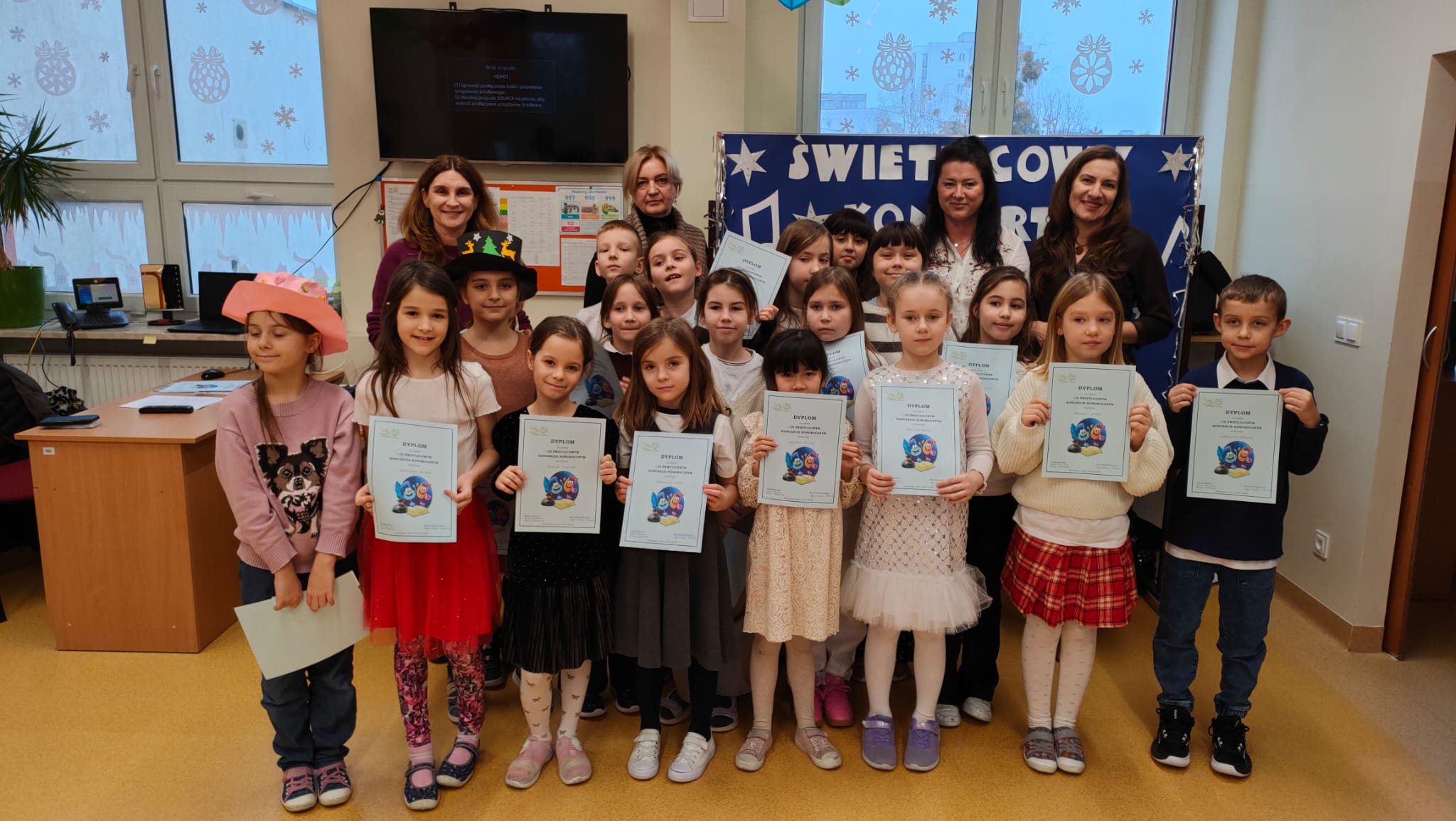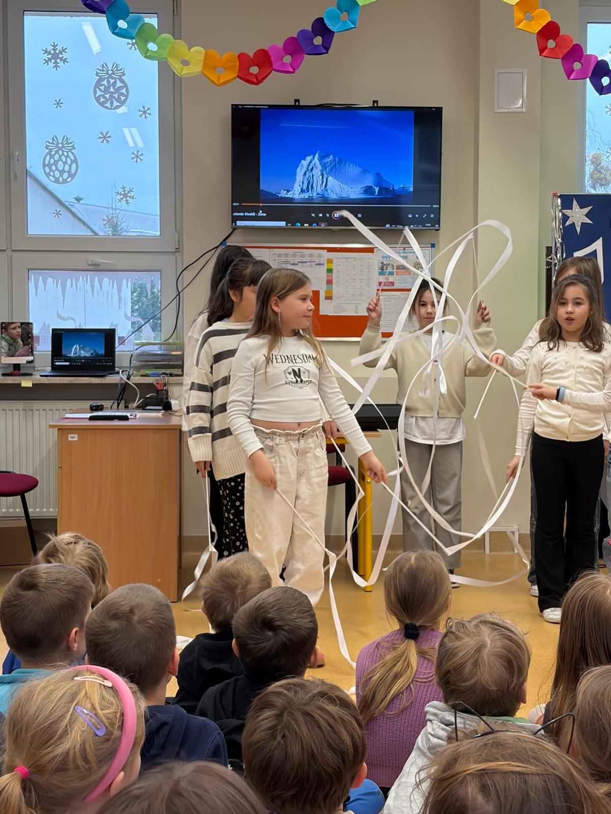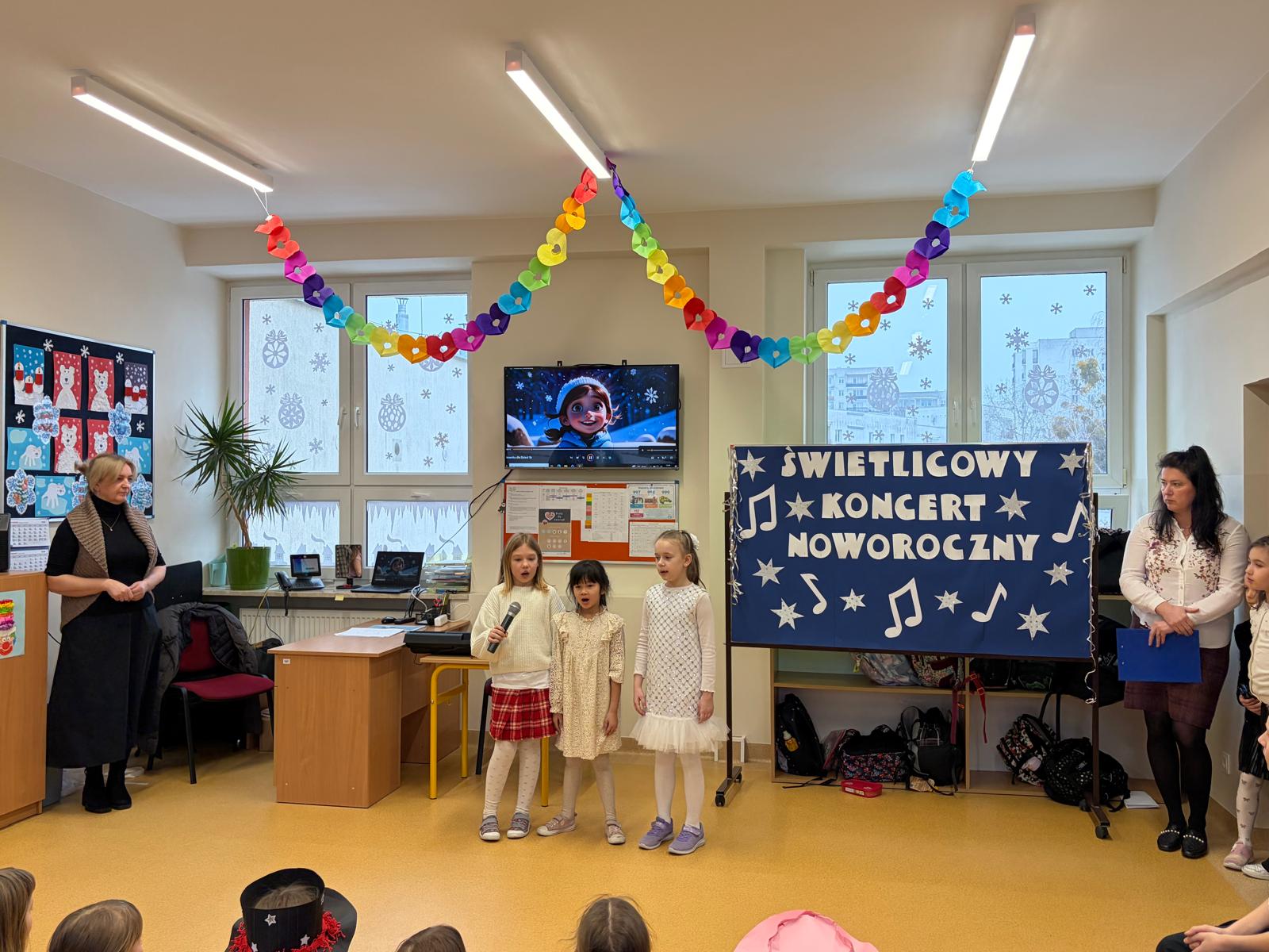 Dnia 10. 02. 2026 w naszej świetlicy odbył się już kolejny Koncert Noworoczny. Uczniowie z różnych grup zaprezentowali swoje umiejętności wokalno-instrumentalne w piosenkach: „Zima woła nas” (kl. 2B), „Mała śnieżynka”(uczennice z kl. 1A I 1B), „Przyjedź do nas Mikołaju” (uczennice kl. 2C), „Zima, zima, zima” oraz „Zaśnieżone miasta”(uczennice z kl. 3C). Wspólnie zaśpiewaliśmy piosenkę „Pada śnieg”. Wysłuchaliśmy pięknej poezji w wykonaniu A. Dąbrowskiej i A. Komisarskiego (kl. 3C), którzy recytowali wiersz zatytułowany „Kolorowy śnieg”, (uczennica kl.3C) wiersz pt.: „Zima”. Słuchaliśmy również utworu „Zimowe rady”(uczennice kl.3C). Koncert uatrakcyjnił występ uczennicy z kl. 2A , która zagrała dwa utwory na kaybordzie: „Deck the Halls” i „Koci blues”. Podziwialiśmy układ taneczny z szarfami do utworu A. Vivaldiego „Zima” w wykonaniu uczennic z kl. 3C. Odgadywaliśmy też zagadki bajkowo – muzyczne. Mamy nadzieję, że ten koncert sprawił dużo radości ze wspólnego słuchania i śpiewania oraz otworzył nasze serca na nowe doznania artystyczne w Nowym Roku. Artyści zostali nagrodzenie gromkimi brawami, dyplomami i upominkami.