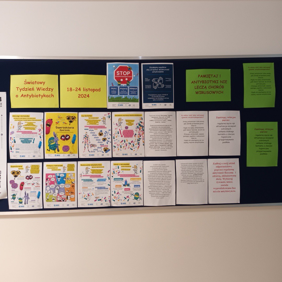 W nawiązaniu do zaleceń PSSE i hasła tegorocznych obchodów Światowego Tygodnia Wiedzy o Antybiotykach – edukujemy, wspieramy i działamy w zakresie podnoszenia świadomości na temat złego stosowania lub nadużywania antybiotyków: – na ten temat zostały przeprowadzone warsztaty, pogadanki i rozmowy indywidualne z uczniami. Poza tym nasi uczniowie poszerzają swoją wiedzę na ww. temat analizując zawartość gazetki ściennej usytuowanej w bardzo dostępnym dla wszystkich miejscu.