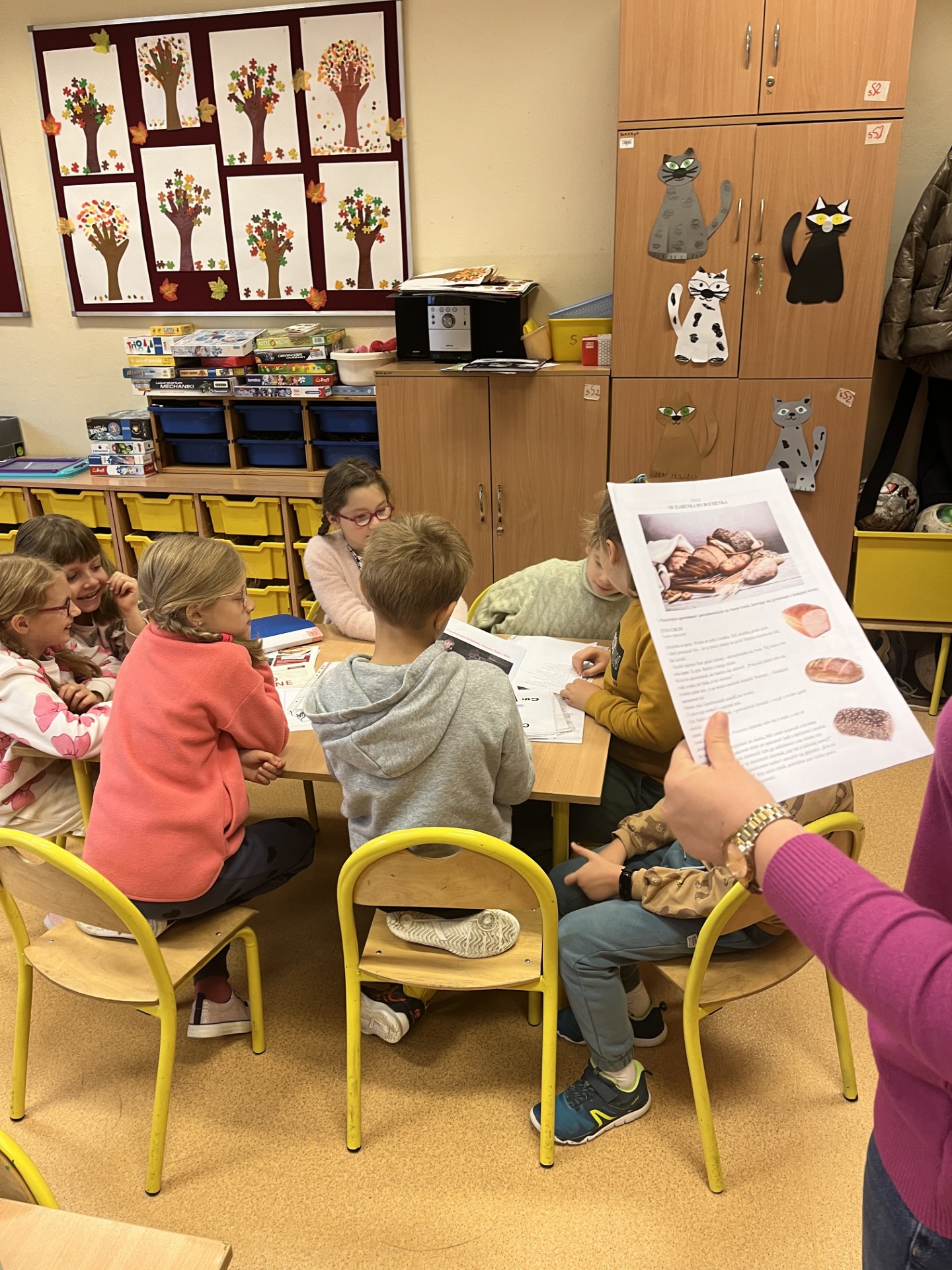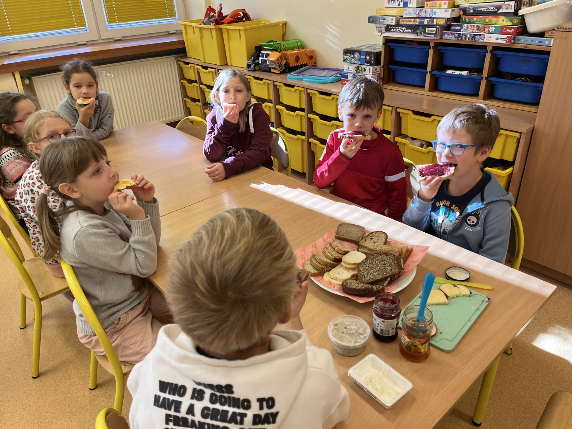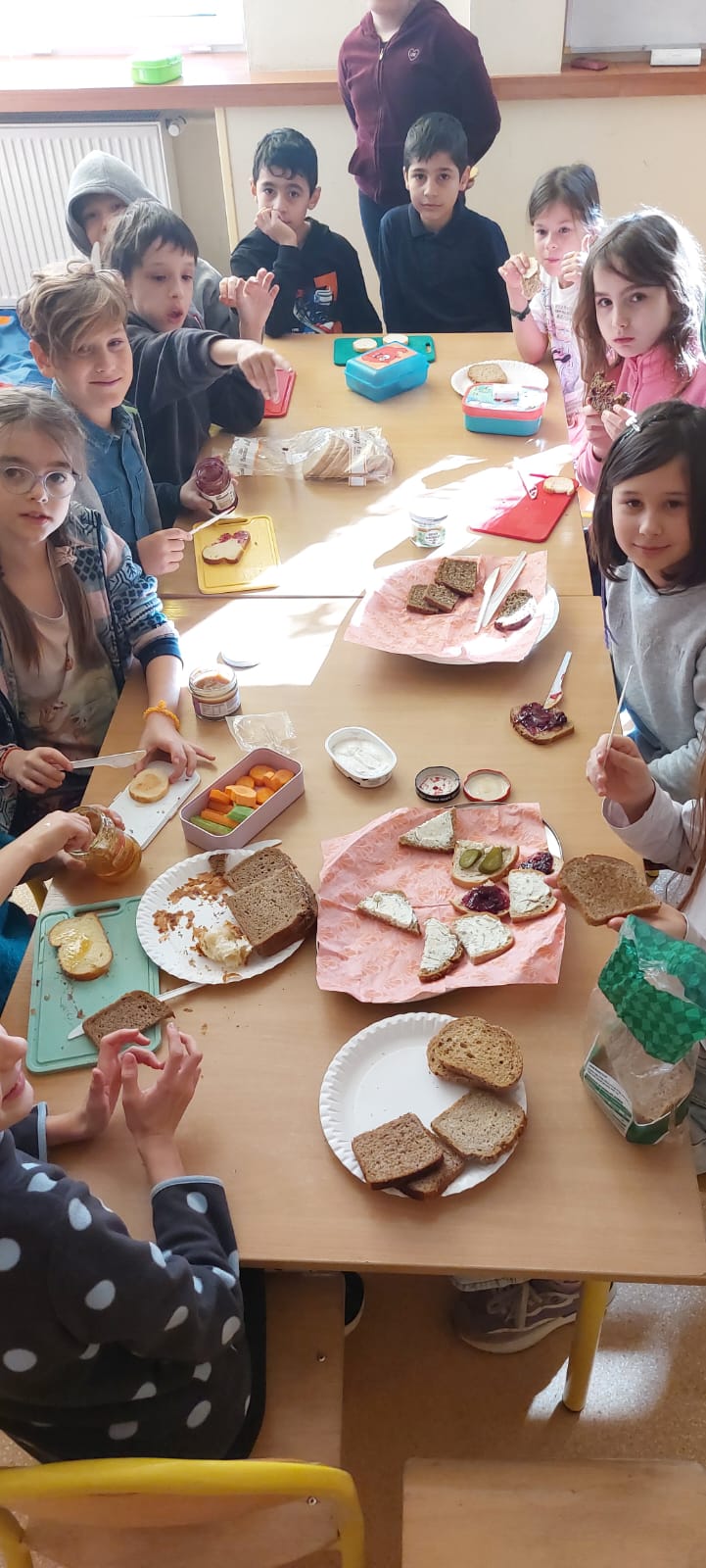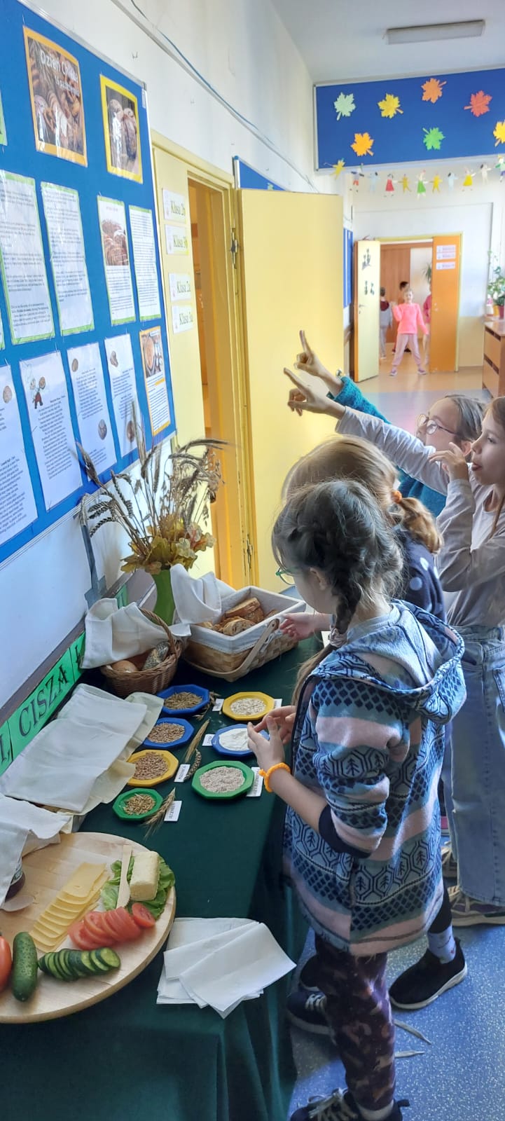 Uczniowie brali udział w zajęciach o początkach rolnictwa i pierwszych próbach wypiekania chleba. Omówiliśmy etapy powstawania tego produktu oraz pracę ludzi różnych zawodów związanych z wypiekiem pieczywa. Zapoznaliśmy się z licznymi hasłami, przysłowiami o chlebie i roli. Z wielką uwagą oglądaliśmy filmy, „Od ziarenka do bochenka”, „Jak powstaje chleb?” oraz wysłuchaliśmy legendy „O chlebie co zamienił się w kamień”. Jednak najbardziej z niecierpliwością czekaliśmy na degustację świeżutkiego pieczywa z masłem, miodem, dżemem czy serkiem. Tak przygotowanymi kanapkami częstowaliśmy dyrekcję oraz pracowników szkoły.