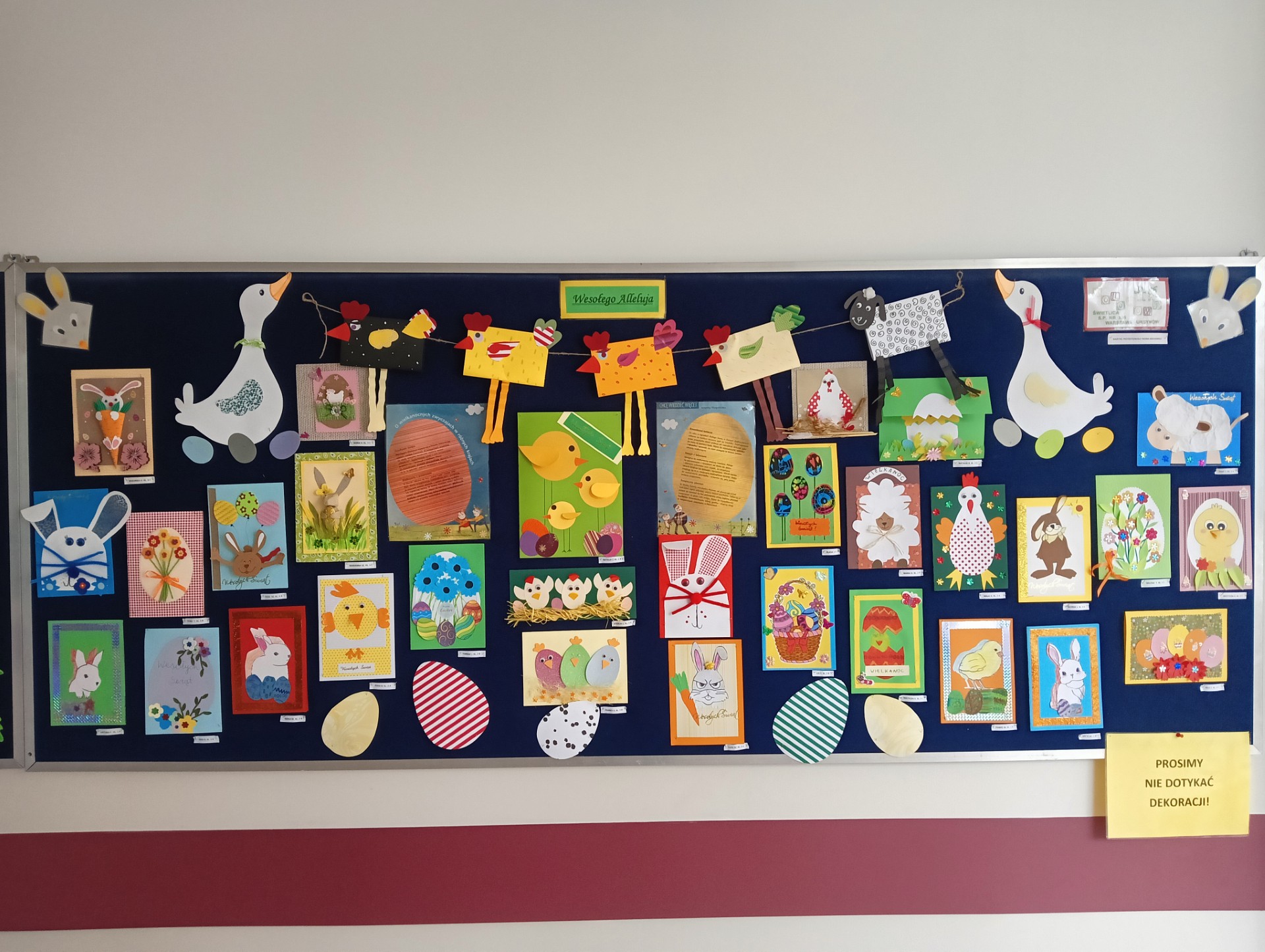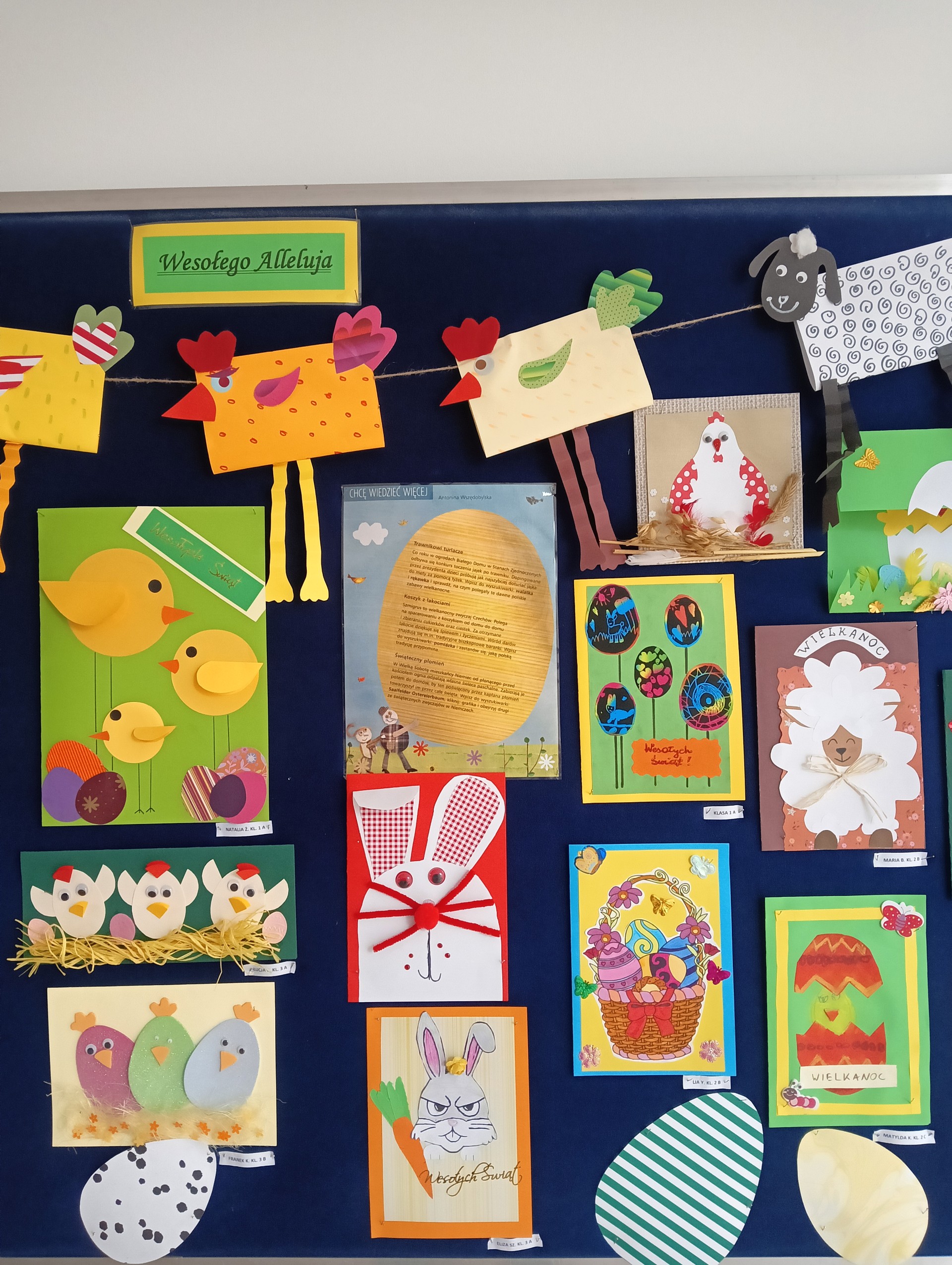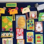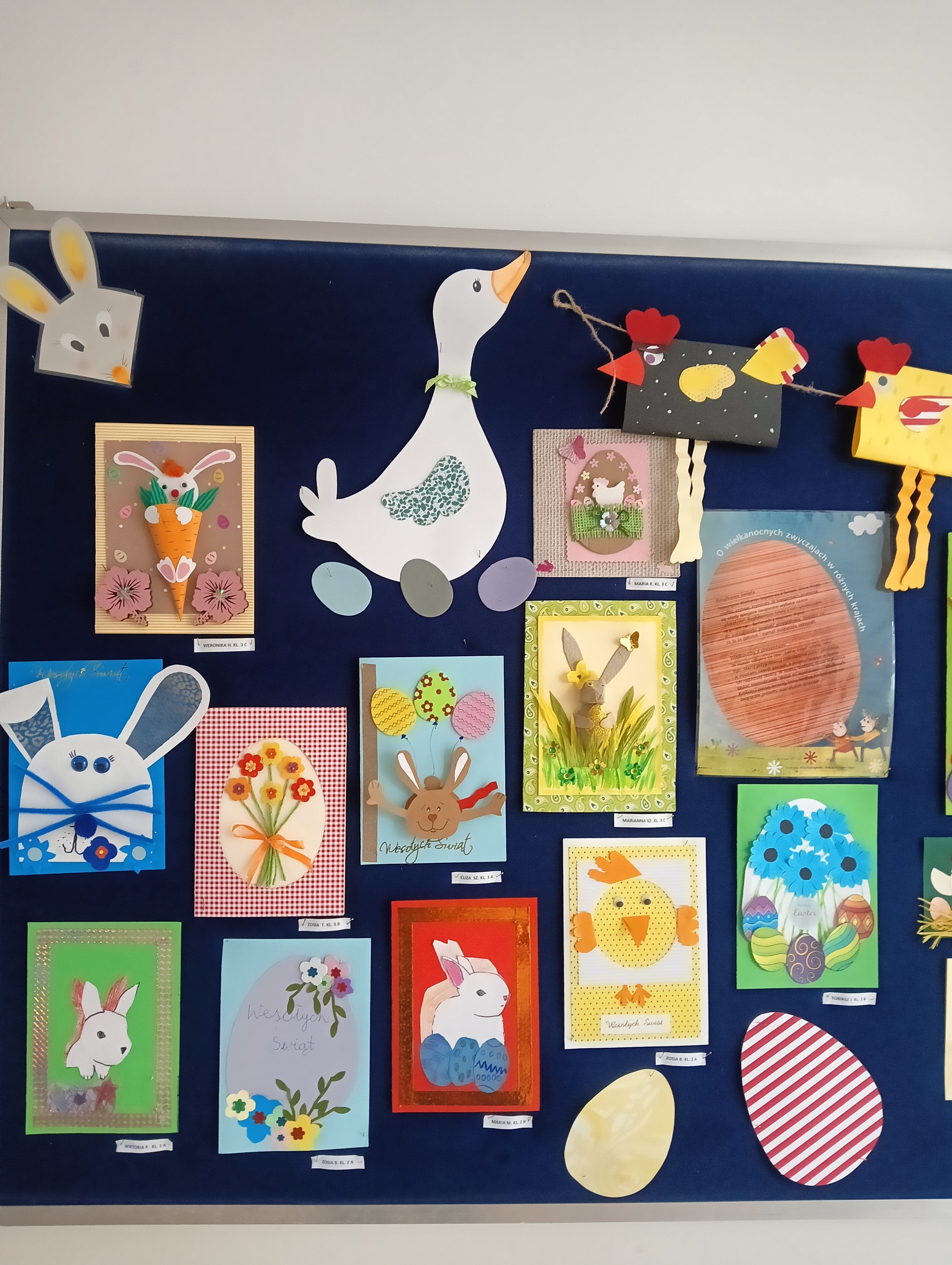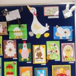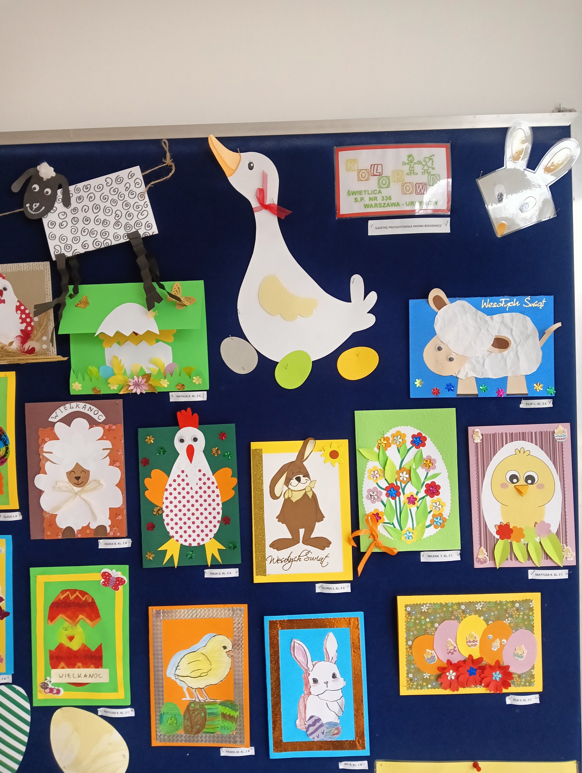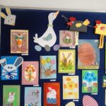 Przed świętami w naszej świetlicy odbyła się wystawa plastyczna pt. ,,Wielkanocna kartka”. Prace wyeksponowane były w łączniku szkolnym. Karty okolicznościowe wykonały dzieci z klas 1- 3 uczęszczające do świetlicy. Przepiękne, kolorowe, wiosenne prace przedstawiały symbole wielkanocne takie jak: kurczak, zając , baranek, pisanki. Uczniowie wykazali się dużą kreatywnością wykorzystując różne materiały dekoracyjne, zboża , kolorowe pióra, kwiaty itp. Wraz z kolorowymi kartkami świetlica życzyła wszystkim wesołych i tak samo barwnych Świąt Wielkiej Nocy, ciepłych i radosnych spotkań rodzinnych i mokrego Śmigusa Dyngusa.
